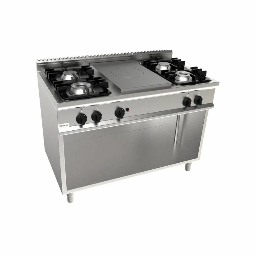 Cuisinière 4 feux + plaque coup de feu à gaz sur meuble ouvert
